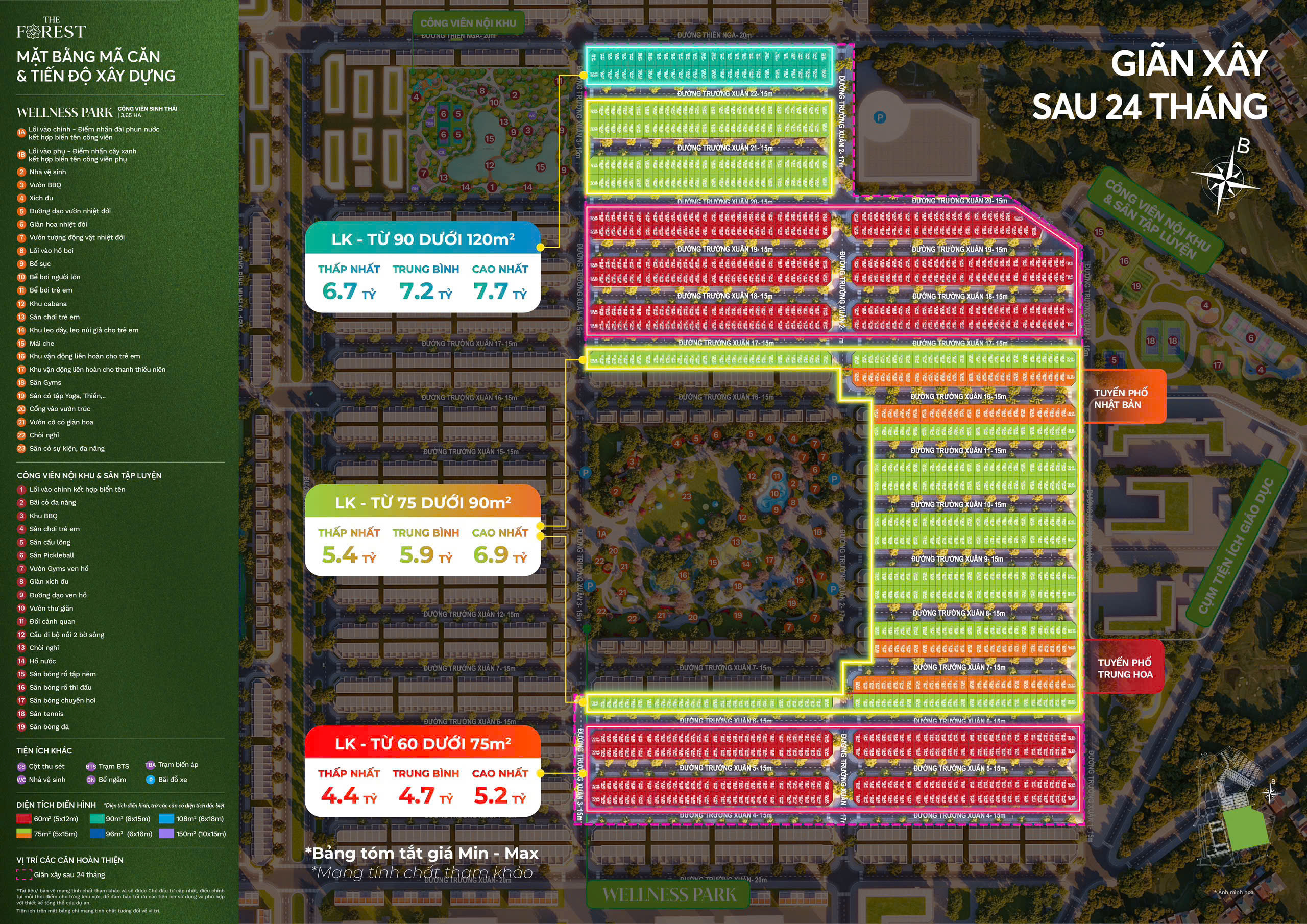 7.2ha. a. Công viên trung tâm - Wellness Park: Diện tích 3.6ha. + Bể bơi resort dưỡng sinh, khu gym, Khu Kidzone, Khu BBQ b. Công viên Forest 1: + Sân cầu lông, Sân bóng rổ, Sân Pickball, khu Gym, Kidzone, BBQ - Với tổng diện tích 13.908m². + Hồ cảnh quan 2.682m², chiều sâu từ 2.5-3m. c. Công viên Forest 2: Diện tích 15.402m². + Khu vận động thể thao ngoài trời, 1 sân bóng đá, 2 sân tennis, 2 sân cầu lông, 1 sân bóng rổ thi đấu, 4 sân bóng rổ tập ném, 3 sân bóng chuyền, 5 sân pickball, khu gym, kidzone. d. Công viên Forest 3: Diện tích 6.516m². + Sân chơi trẻ em, thể thao kết nối cộng đồng. e. 2 tuyến phố thương mại/ ẩm thực và dịch vụ thiết kế kiểu: Nhật Bản - Trung Quốc. f. Hệ thống giáo dục 3 khu trường học. g. Hệ thống shophouse mặt đường 3/2 và shop villa công viên trung tâm. |