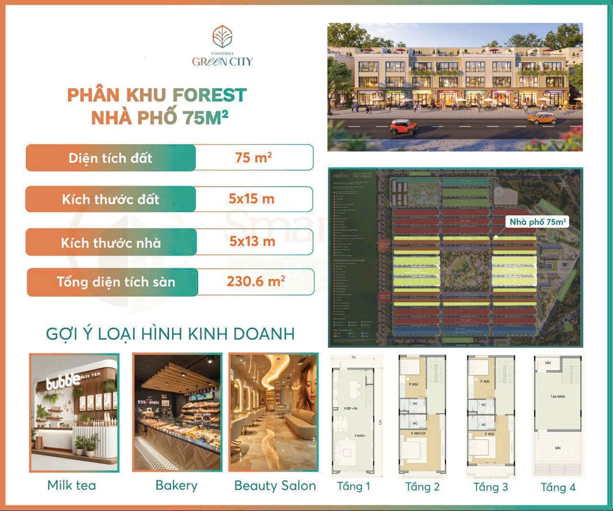 The Forest Vinhome Green City. Sản phẩm Nhà phố + Shophouse: + Loại diện tích: 60m² - Số lượng: 791 căn. + Loại diện tích: 75m² - Số lượng: 897 căn. + Loại diện tích: 90m² - Số lượng: 684 căn. + Loại diện tích: 120m² - Số lượng: 79 căn. + Loại diện tích: >150m² - Số lượng: 20 căn. Sản phẩm Biệt thự: + Loại diện tích: 175m² - Số lượng: 40 căn. + Loại diện tích: 175m² đến 250m² - Số lượng: 10 căn. + Loại diện tích: từ 250m² - Số lượng: 10 căn. |