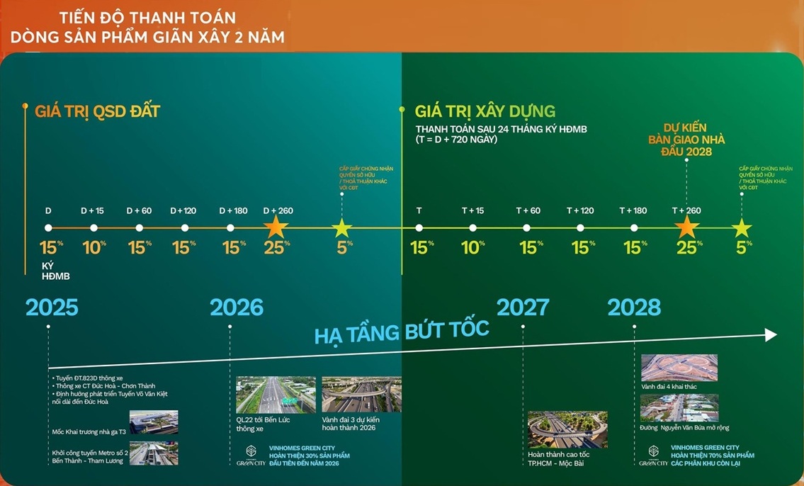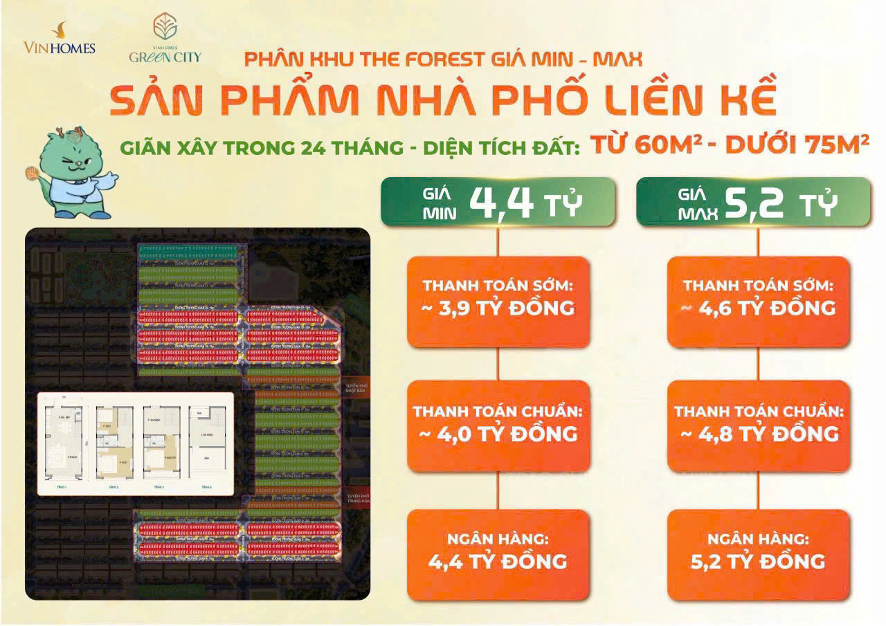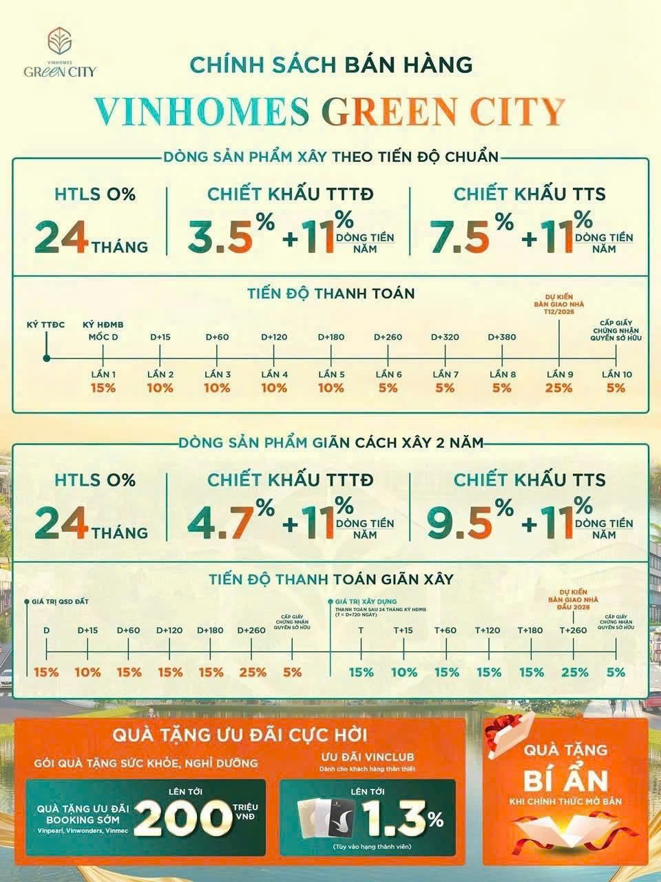 Thanh toán từ 850 triệu/căn diện tích 60 tại Vinhome Green City. Chủ đầu tư hỗ trợ 24 tháng ân hạn gốc và lãi suất xuyên suốt.